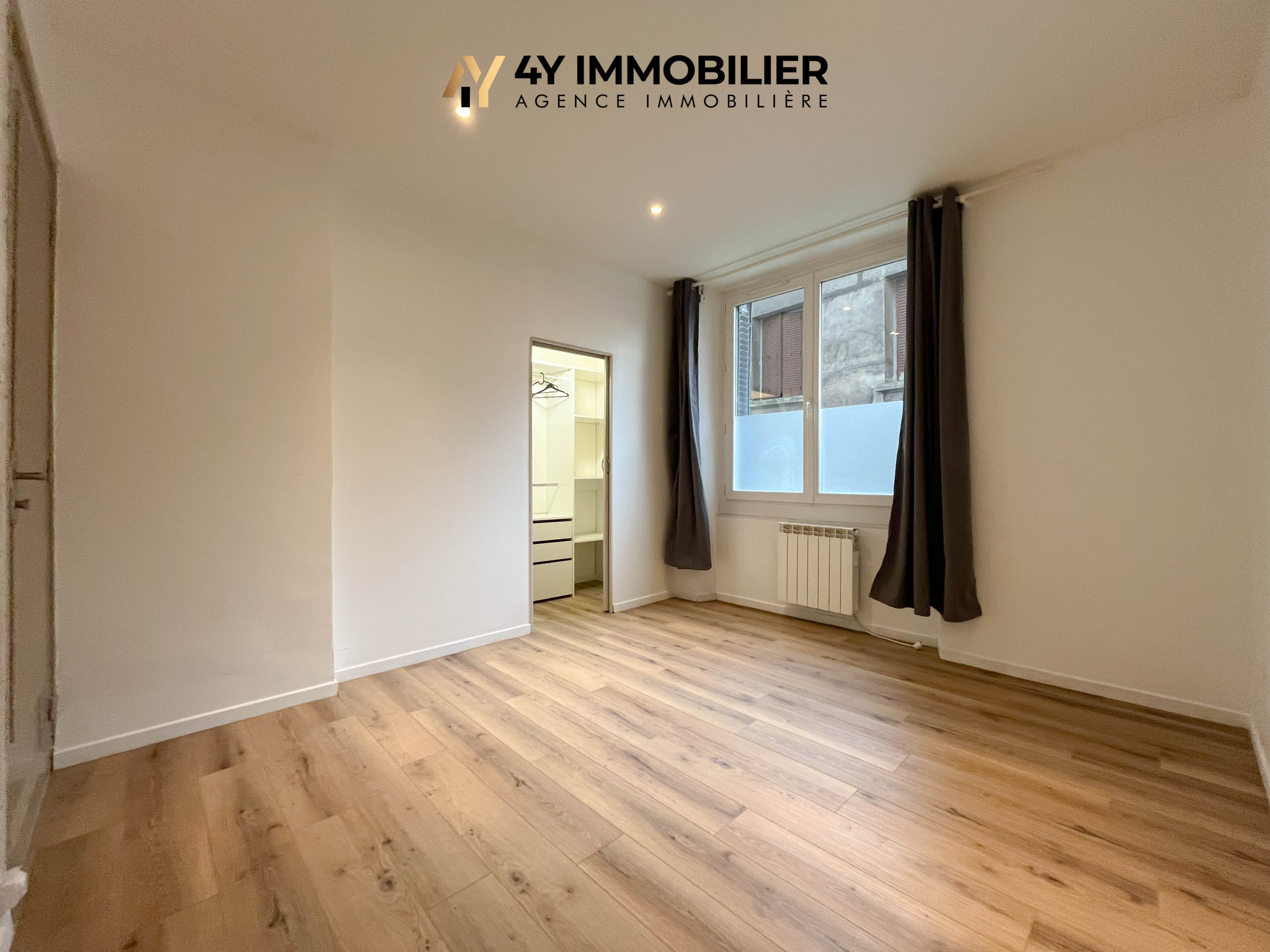 La chambre, côté cour, dispose d’un dressing optimisé. La salle d’eau a été rénovée avec une cabine de douche neuve.