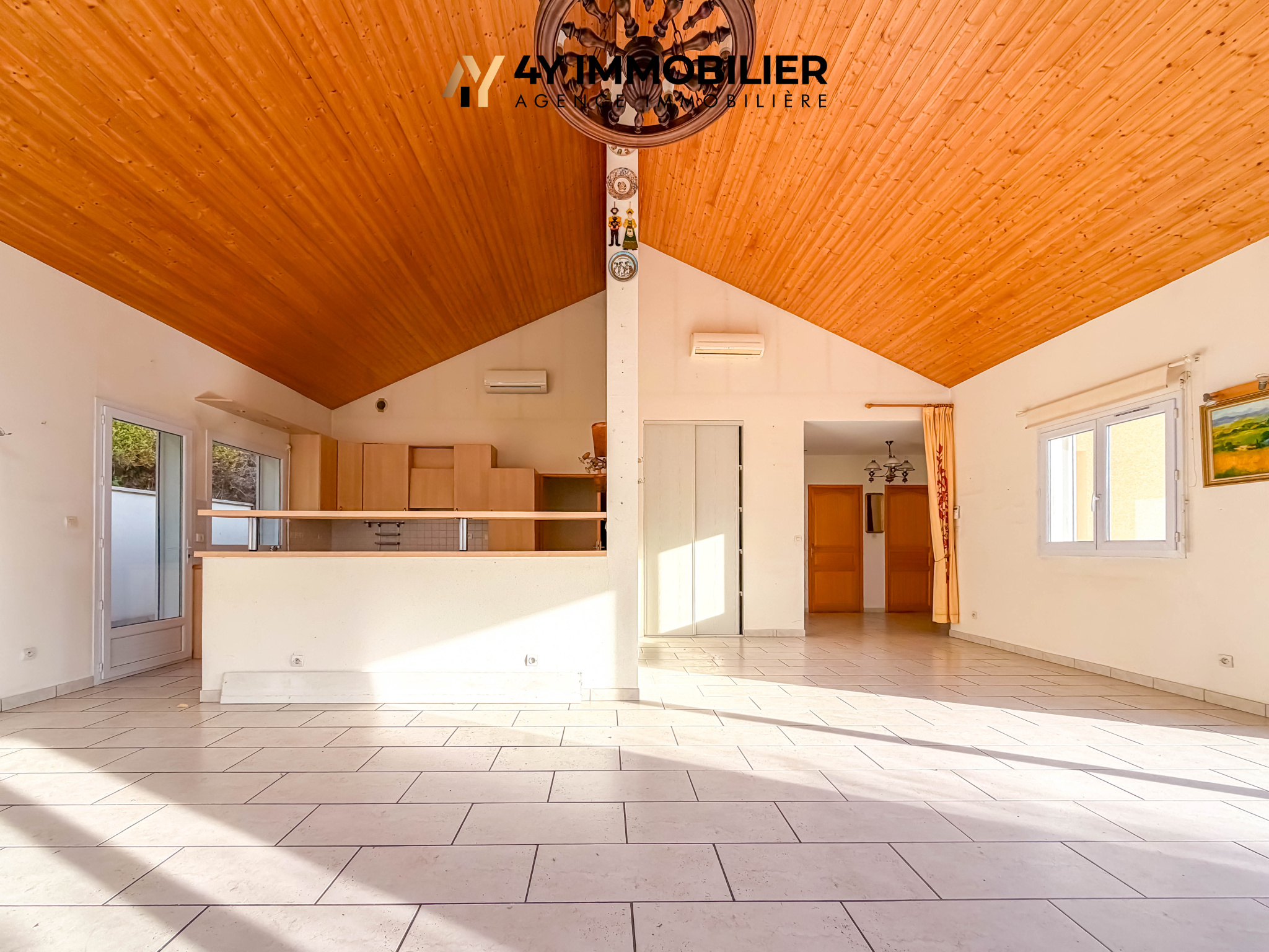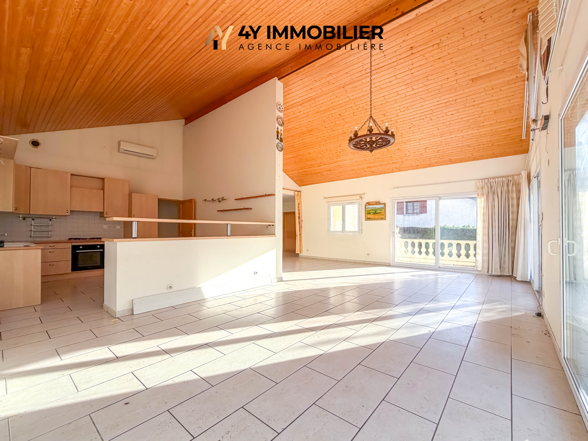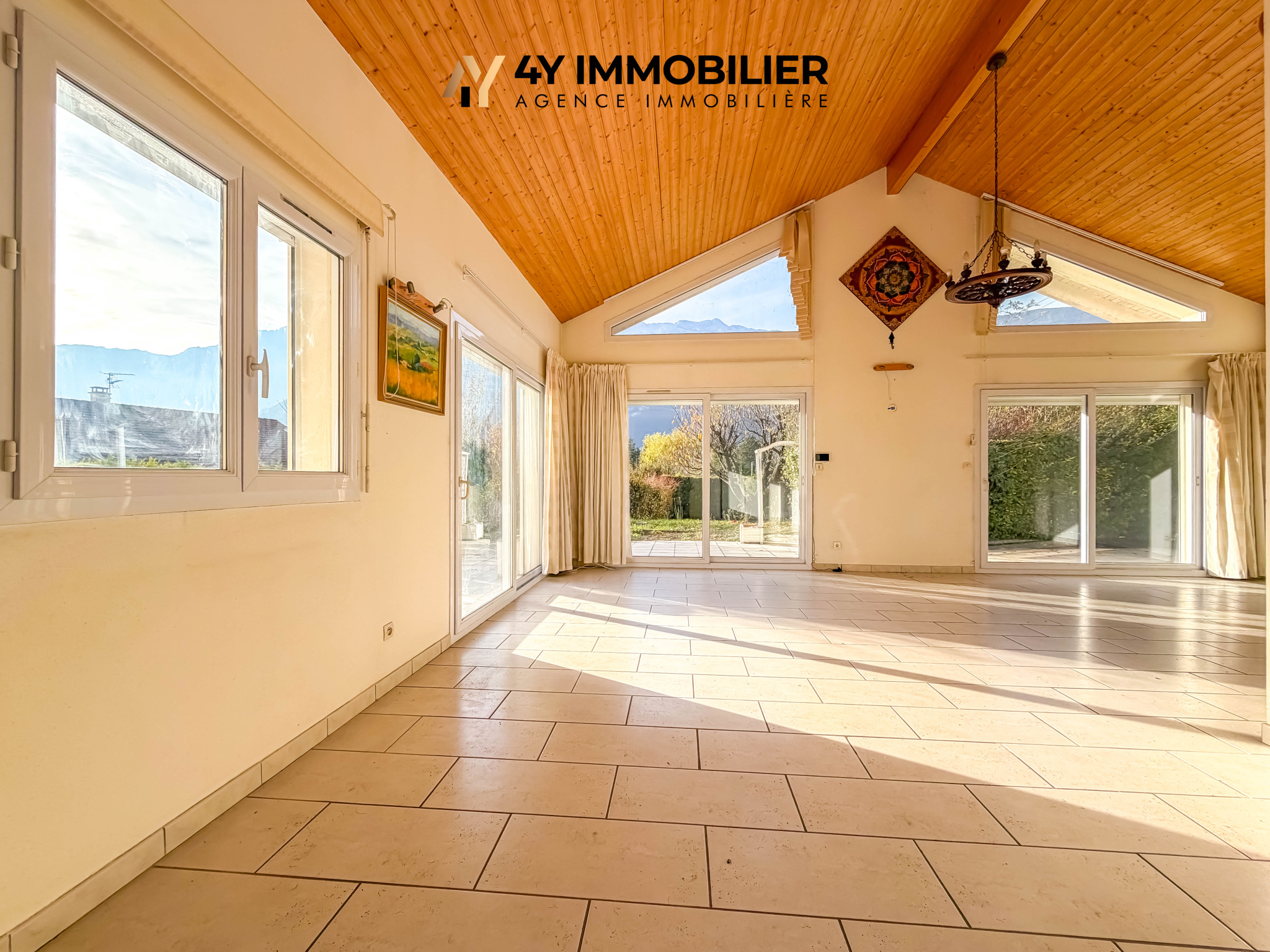 De plain-pied, elle propose une vaste pièce de vie d’environ 60 m2 avec cuisine ouverte et plafond cathédral, baignée de lumière grâce à ses larges ouvertures exposées sud-ouest, avec en prime une vue dégagée sur le Vercors.