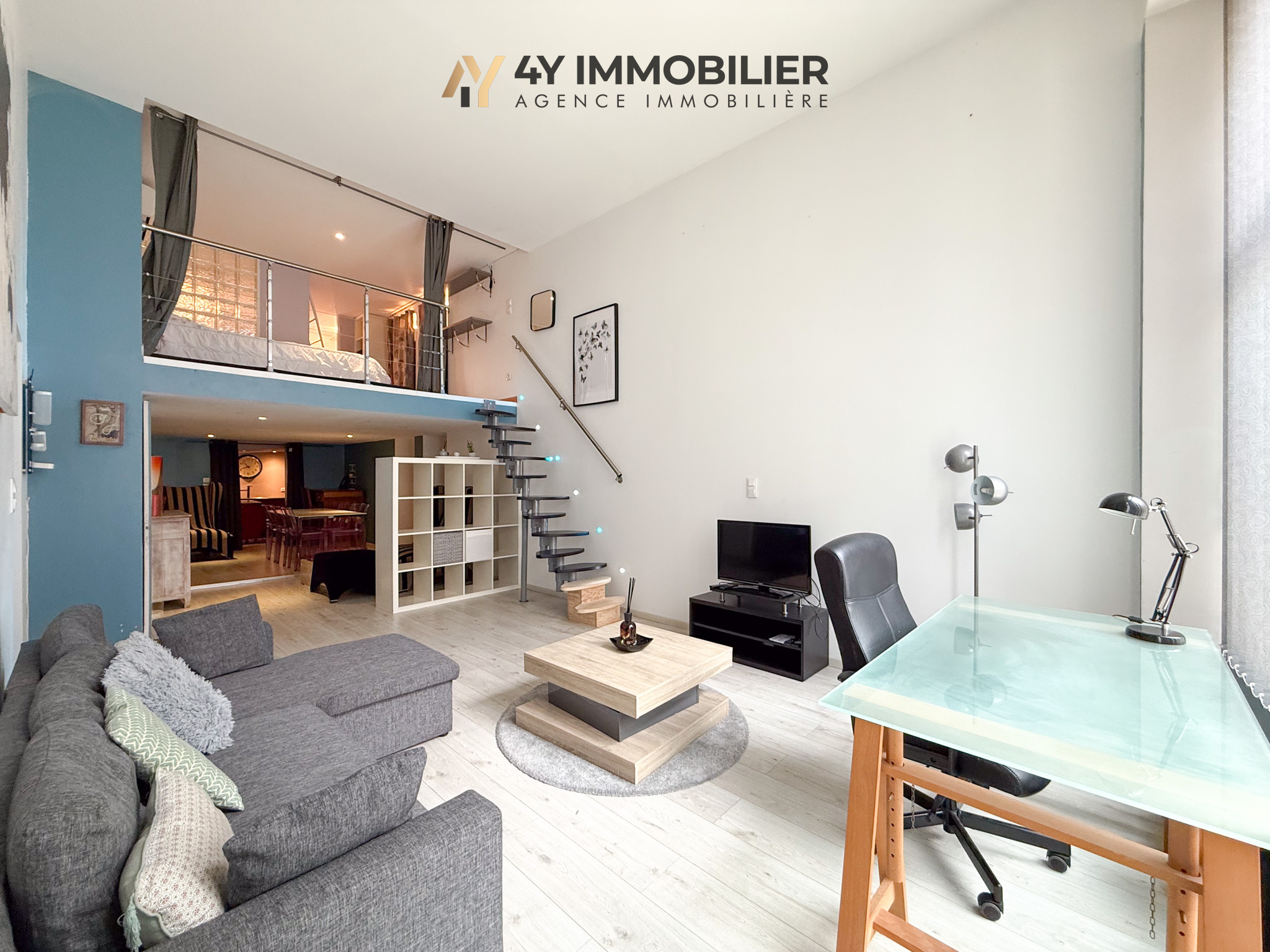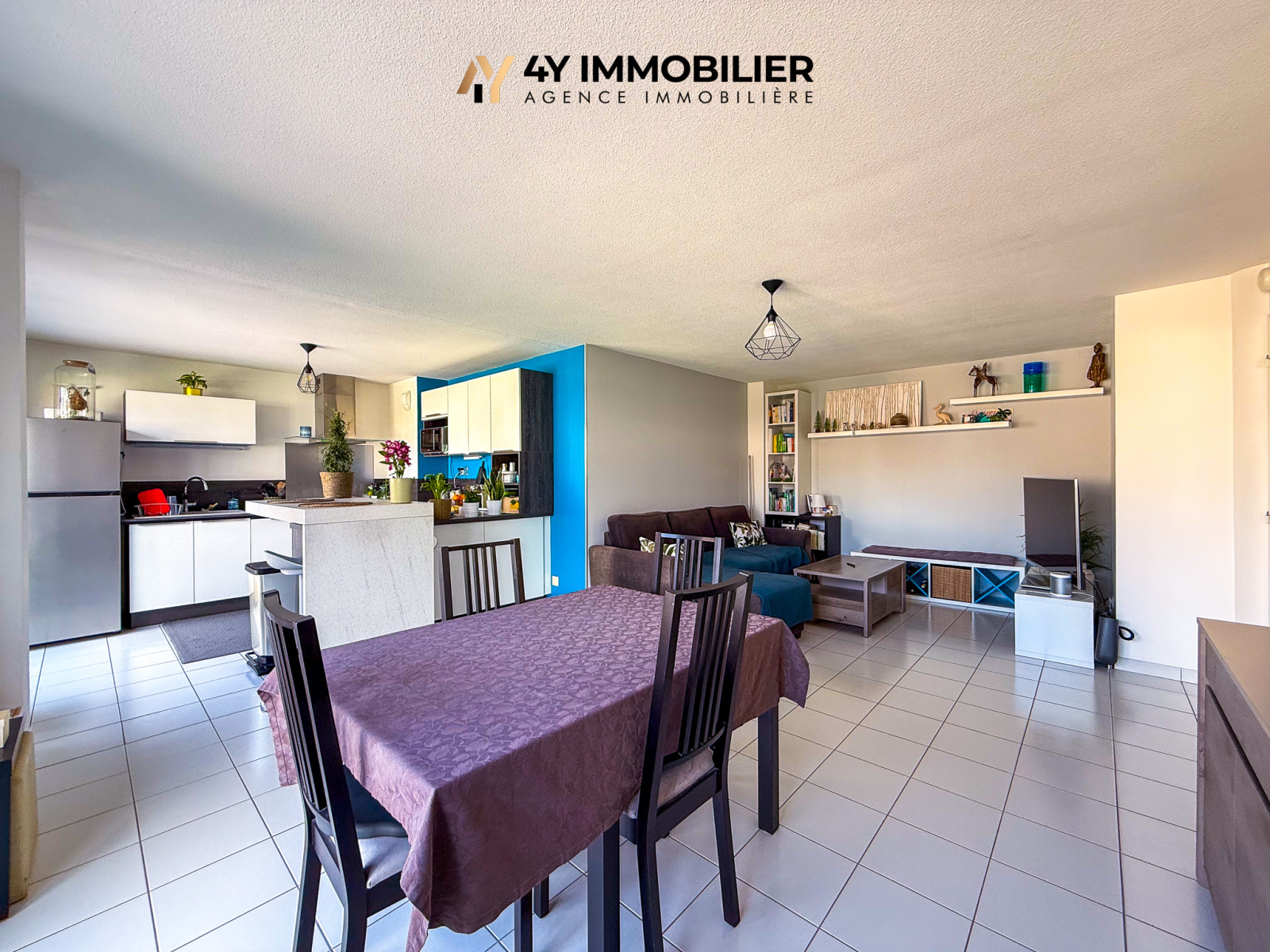 La pièce de vie, baignée de lumière avec ses deux grandes baies vitrées et d’un volume généreux, est ouverte sur une cuisine entièrement équipée.